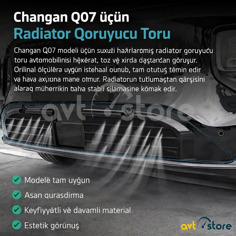 Changan Q07 modeli üçün xüsusi hazırlanmış qoruyucu tor radiatoru həşərat, toz və xırda daşlardan qoruyur. Orijinal qəliblə istehsal olunub, avtomobilə tam uyğun oturur və hava axınını məhdudlaşdırmadan tıxanmanın qarşısını alır. Quraşdırılması asan, görünüşü isə estetikdir.
